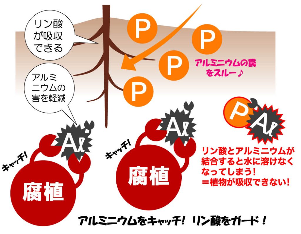 腐植酸やフルボ酸の一部は土壌中でキレート効果を示し、これによりリン酸や微量要素が吸収されやすい形になります。