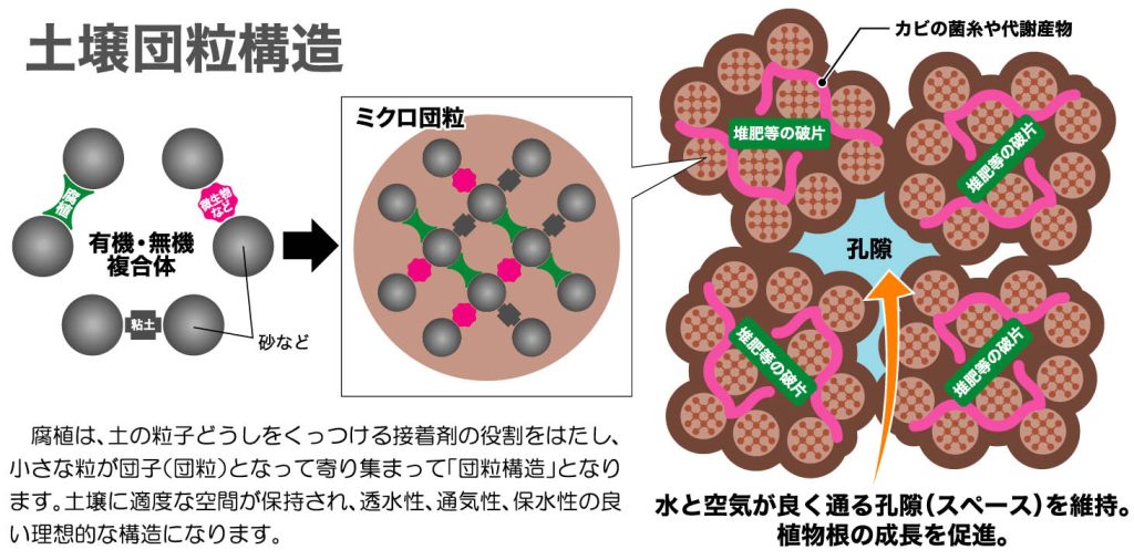 腐植物質や微生物が砂や粘土の微粒子をくっつけ、小さな粒が寄り集まって、団子のような粒子を形成することを「団粒構造」といいます。